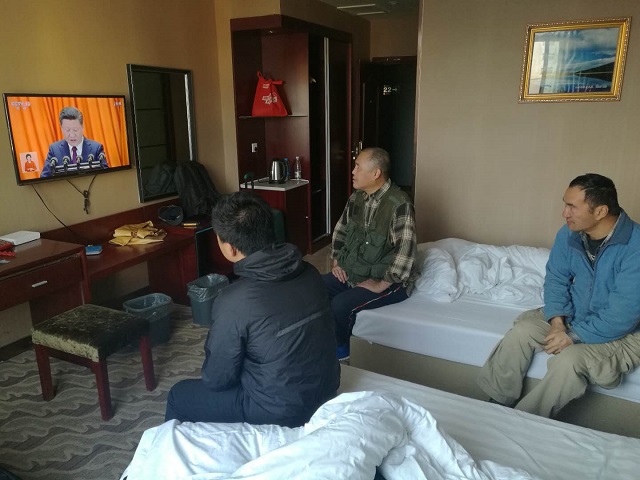 “塔里木盆地中东部航空重磁综合测量”勘查子项目组党员干部在新疆且末通过电视收看
