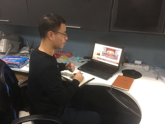 “东天山黄山-启鑫地区航空物探(磁梯度、放)测量”勘查子项目组党员干部通过电脑收看