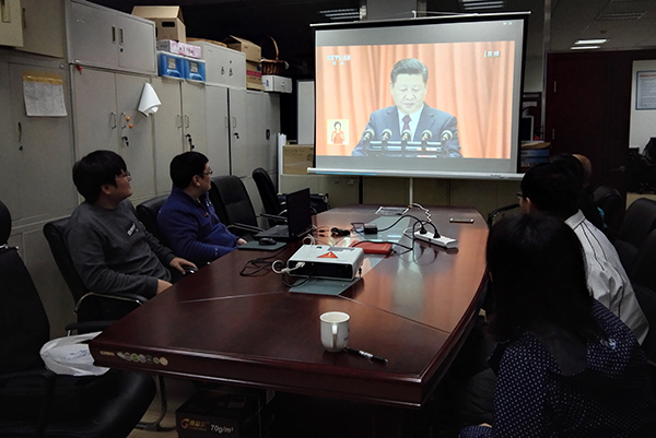 10月18日上午,航空物探方法技术室在遥感楼326会议室组织全体在京人员收看十九大开幕。