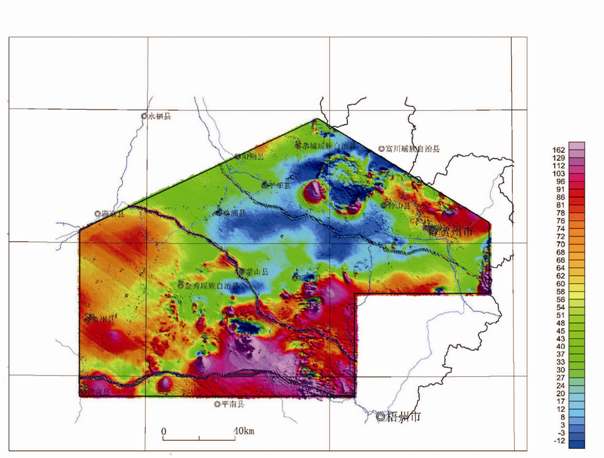 磁场特征: 测区磁场较为平静(图1), 区域磁场Δ T 值变化范围不大,总体上在-30~30nT之间。由区域地质资料可知, 测区内主要出露地层为侏罗系、石炭系、泥盆系、寒武系,其岩性主要有砂岩、砾岩、页岩、板岩、灰岩、硅质岩、白云岩等。根据岩石磁性的一般规律,以上岩类基本为无磁性或弱磁性岩石。测区区域磁场特征也表明, 这些岩石磁性也符合这一规律。局部异常少, 强度一般在250~500nT之间,大囲山一带的局部异常最强,ΔTmax达到1300nT左右。对照区域地质图,局部异常多在中性、酸性岩体上或岩体边部,表明局部异常多为中性、酸性岩体引起或与之相关。