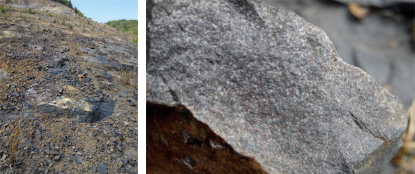 (3)对桂东北地区1∶5万航空物探异常进行初步解释,初步选编13处航磁异常和12处航空伽马能谱异常,对其中11处具有代表性的异常进行地面踏勘,新发现小型铁矿异常1处。在桂C-2014-3号异常(图3)中心处发现大面积的磁铁矿和赤铁矿,采集3块标本进行矿石分析,Fe含量均达到26%,最高值为43%。除了Fe元素以外,发现Mn、Zn、Ti均有一定的含量。
