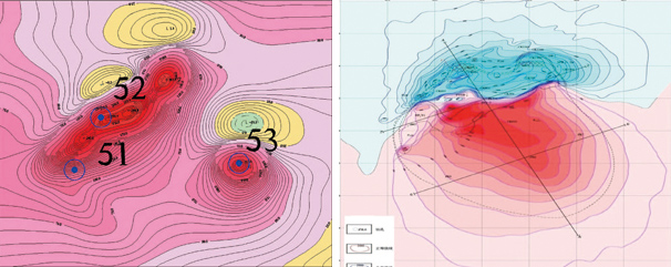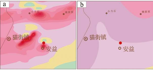 图1 安益异常(53号)航磁与地磁对比(左为航磁,右为地磁)