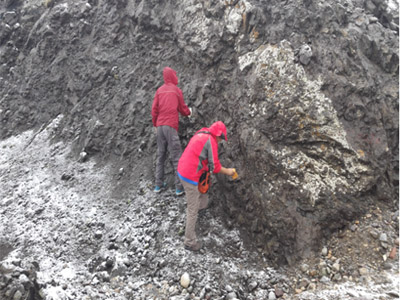 7月中旬至9月,正直新疆地区高温红色预警,工作组制定了高温防暑防汛预案,克服恶劣天气带来的种种困难。路线踏勘时,虽然挥汗如雨,工作组成员却仍然不疏忽每一个测点;物性测量时,虽然石头烫手,工作组成员却仍将样品视为手中珍宝;狂风袭来时,虽然沙石飞扬,工作组成员却依然躬身测量认真记录;酷暑突遇降雪,虽然毫无防备,工作组成员依然在飞雪之下精挑细选样品。无论是40度的高温,还是漫天风雪,工作组的同志们都充分发挥地质工作“三光荣、四特别”的优良传统,抢抓野外工作黄金期,坚持工作,确保质量。(张婉)