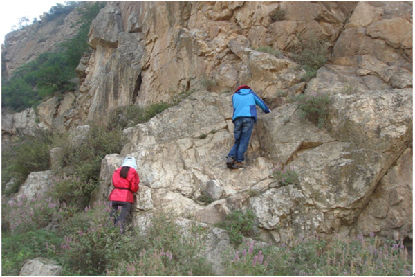 测区包括河北省北部的张家口、承德地区以及内蒙古自治区南部的多伦县。测区昼夜温差较大,虽然气温不及北京炎热,但强烈的紫外线依然令皮肤倍感焦灼。为了高效高质量地完成工作,在项目负责人李文勇的带领下项目组人员团结友爱,积极主动,不畏艰险,不放弃任何一个勘探点,手脚并用地在茂密的植被覆盖区攀爬,只为到达山顶对探槽中的铁矿石进行观察。新职工单希鹏在途中被马蜂蜇咬了手指,却依然坚持爬到顶峰,徐晶晶巾帼不让须眉,工作起来也毫不逊色。到达顶峰的那一刻,虽然汗水浸湿了衣襟,但见到了眼前的铁矿石,大家心中充满了喜悦。两名新职工不仅学习到许多现场识别岩矿石的知识,也体验到野外工作的艰辛,感受到了“求真 奉献 创新 图强”的航遥精神。