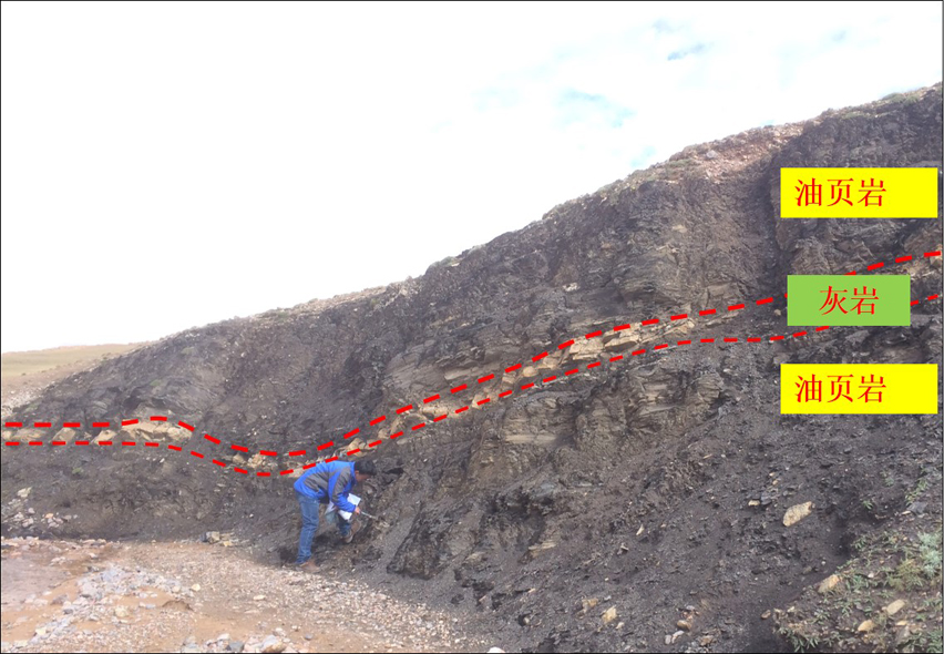 本次野外物性测量路线主要包括3条:1)青藏公路那曲至雁石坪镇,横穿整个羌塘盆地,此路线中生界三叠系与侏罗系分布较广。中生界海相沉积层是羌塘盆地的油气勘探主要目的层,也是本次野外工作重点测量的目的层;2)那阿公路那曲至尼玛段,对应羌塘盆地南界及班公湖-怒江缝合带,此线路重点完成了对缝合带内蛇绿岩套的测量和调查。蛇绿岩套整体表现为“高磁高密”的特征,其内部超镁铁质岩磁化率极强,磁化率值最高可达10010×10-5SI,平均密度高达2.97 g/cm3;3)尼玛、班戈至双湖一线,主要对羌塘盆地腹地中-新生界进行测量,并对盆地内部油气苗点进行了重点考察。羌塘地区油页岩为深灰、灰黑色,弱油脂光泽,用打火机可直接点燃,火焰长约2cm,并发出浓烈的焦油臭味。