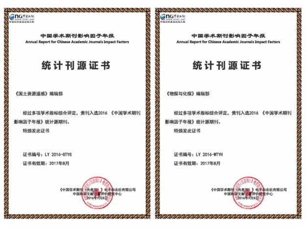 由中心主办的《物探与化探》和《国土资源遥感》两本期刊均继续入选2016年《中国学术期刊统计因子年报》。《物探与化探》影响因子为0.836,在“地质学”学科的103种期刊中影响力指数排名第51位,影响因子学科排序第59位,入选Q2区。《国土资源遥感》影响因子为1.588,在“测绘科学技术”学科的27种期刊中影响力指数排名第6位,影响因子学科排序第3位,入选Q1区;在“自动化技术、计算机技术”学科的112种期刊中影响力指数排名第25位,影响因子学科排序第8位,同样入选Q1区。