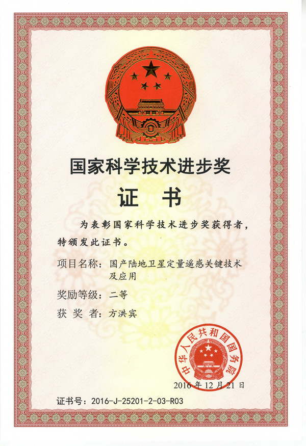 “国产陆地卫星定量遥感关键技术及应用”成果由中科院遥感地球所牵头,中心作为第三完成单位参与联合攻关,方洪宾教授是第三完成人。中心主要参与了国产陆地卫星数据质量改善、规模化应用工程处理关键技术的研发、示范应用和规模化推广等,获奖成果重点攻克了国产陆地卫星数据质量提升、中国复杂多变环境下的定量遥感反演、定量遥感规模化工程处理关键技术,构建了国产陆地卫星定量遥感技术体系,在国土等18个行业,京津冀等11个区域以及全球43个国家和地区推广应用,实现了国产陆地卫星定量化应用水平的跨越式发展,极大推动了国产陆地卫星多星、多领域的综合应用,取得了巨大的社会经济效益和国际影响力。