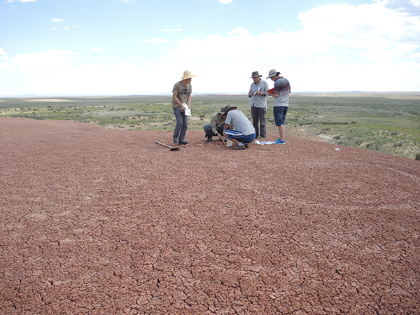 盛夏的北疆准噶尔盆地北缘广袤的戈壁滩地上,骄阳似火,项目组头顶烈日脚踏荒漠戈壁,对工作区外围已知的黑油山及油砂山进行了实地踏勘并取样,实地观察了利用多光谱数据解译的区域构造,并对古近系和新近系固结、半固结地层,第四系覆盖的戈壁滩地,以及区内唯一孤立隆起的德伦山裸露的不同年代的烃源岩类地层等进行了取样。