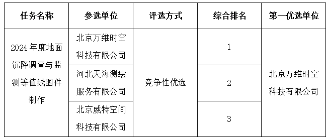 经评议组审查与讨论,推荐得分最高北京万维时空科技有限公司为“2024年度地面沉降调查与监测等值线图件制作”第一优选单位,特此公告。相关单位或个人如对上述优选结果有异议,请在公示文件发布之日起三个工作日内以书面形式反映。