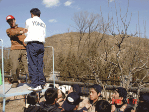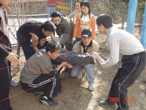 40余名青年被随机分成三个小组,完成了信赖背摔、电网、逃生三个培训项目。在整个活动过程中,要成功完成培训项目,需要集中每一个成员智慧和力量,发挥每一个成员的特长,团结协作,共克难关。每一个项目都能给人很多启发:信赖背摔,不仅是对自我的安全区的挑战,更是一种对团队队员的信任,通过这个项目,可以增强对同伴的信任感和自己的责任感,并且感受这种信任给自己带来的个人突破;过电网的项目是面对一道虚拟的电网,需要合理利用资源,对人力进行科学调配,同时每一名队员都需要其他人的帮助才能顺利过关;逃生是最困难的一个集体项目,10余名队员面对一堵4.2米的光滑水泥墙面,要在不借助任何外力的情况下,在40分钟内徒手翻越高墙,完成这项艰巨的任务需要全体成员有清醒的头脑和周密的计划安排,要有人甘为人梯,用自己的肩膀搭成台阶,通过集体的智慧和力量完成任务。