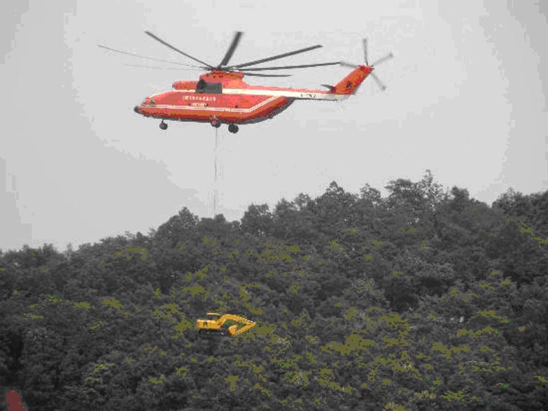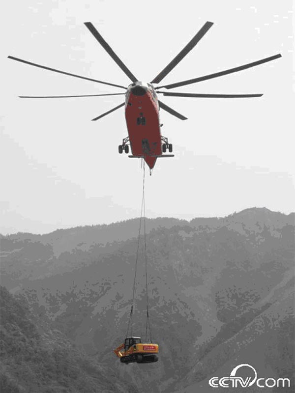 近日,唐家山堰塞湖的险情直接影响着下游上百万人民的安危,能否将大型抢险设备运到工地是抢险工程决胜的关键。5月26日11时06分,米-26直升机,在擂鼓镇将一台13吨多的掘土机轻轻地吊起,送往唐家山堰塞湖坝顶,当天,米-26直升机在擂鼓和唐家山堰塞湖坝顶之间往返十多次,运送8台重型设备至坝顶,为唐家山堰塞湖抢险工程立下了汗马功劳。