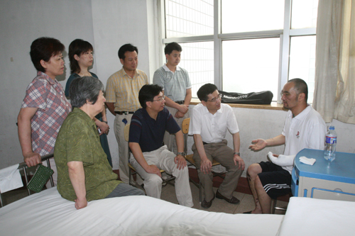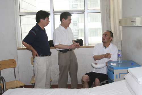 这天一大早,石磊同志就换上了单位统一发放的奥运T恤衫,精神饱满地坐在椅子上。等看到中心领导时,石磊再也按捺不住心中的激动,紧紧握着王平主任的手。王平主任俯下身子,再次仔细查看石磊身上愈合的伤口,并亲切的询问他的身体状况,告诉他在家要好好休养,不要挂念单位。石磊对领导及中心的关心表示感谢,表示会好好恢复身体,尽快回到工作岗位。(物探部)