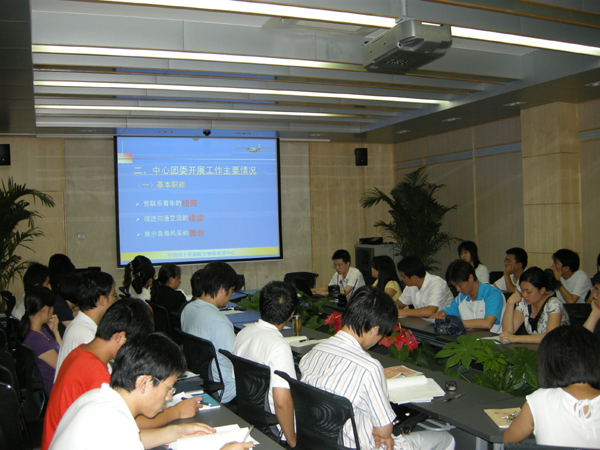 14日下午,中心团委委员及各支部委员与新职工欢聚一堂,中心团委书记庞剑波同志给新职工介绍了中心团委基本情况,几年来团委组织各类活动情况,2008年上半年工作情况以及下半年活动安排。新职工与团委同志热烈讨论几天来的学习心得以及到中心以后的感受,大家畅所欲言,气氛热烈。团委足球、篮球等协会会长则忙着介绍自己的协会,将有运动特长的新职工拉到自己的协会,好不热闹。