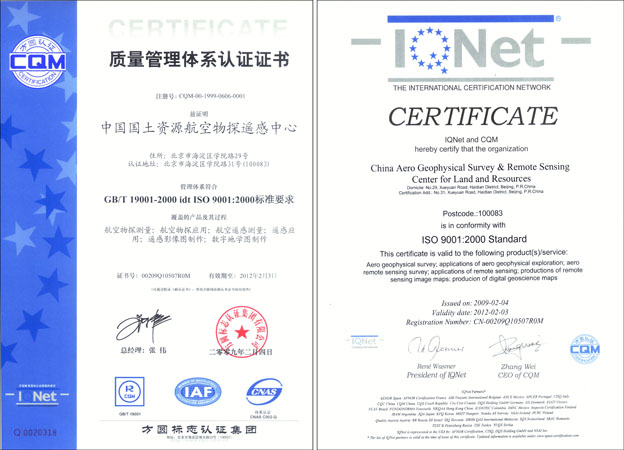 日前,我中心收到方圆标志认证集团有限公司于2009年2月4日颁发的质量管理体系认证证书(注册号:CQM-00-1999-0606-0001)证书的内容是:“兹证明中国国土资源航空物探遥感中心管理体系符合GB/T 19001-2000 idt ISO 9001:2000标准要求。证书名称:质量管理体系认证证书,证书号:00209Q10507ROM。” 这是中心自1998年贯标以来第4次获得认证证书。(总工办/质管办)