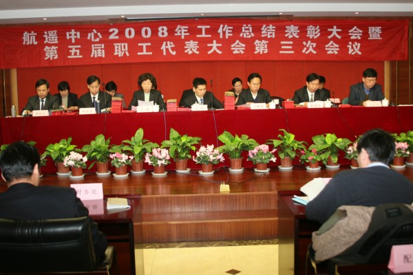 2009年12日上午8点30分,航遥中心2008年工作总结表彰大会暨第五届职工代表大会第三次会议在庄严的国歌声中隆重开幕,中心全体干部职工参加了会议开幕式。首先,中心党委书记王殿琦传达了全国地调工作会议和中国地质调查局2009年工作会议精神。接着,中心主任王平向大会作《航遥中心2008年工作总结》报告。王平主任在总结中指出,08年通过中心全体干部职工的共同努力,中心充分发挥先进技术优势,多项工作取得突出进展,大事、急事、难事得到妥善处理和解决。汶川特大地震灾区应急调查为国家和政府部门抗震救灾决策做出重要贡献,国家专项重大试验获得圆满成功,863重大项目取得显著进展,地质调查工作稳步推进,科学发展观试点活动扎实完成,北京奥运大厦物业中心圆满完成服务奥运的重大使命。