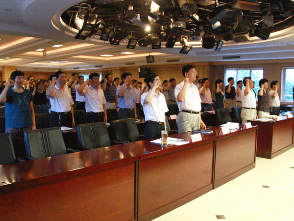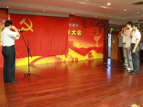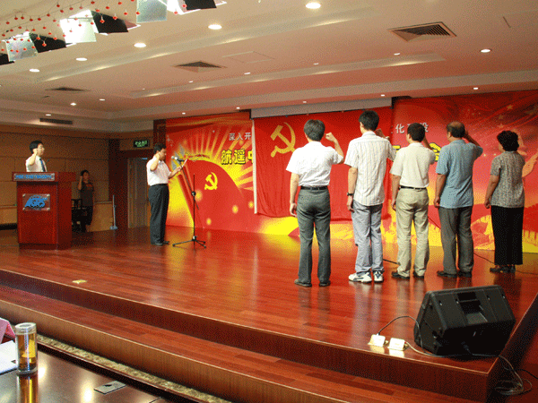 纪念大会在雄壮的国歌声中拉开帷幕。“我志愿加入中国共产党……永不叛党”,5名中心今年新发展的党员和与会的老党员们一起,在中心纪委书记李知用的领誓下,面对鲜艳的党旗庄严宣誓。那凝聚着共产党员共同信仰的铮铮誓言,让全体党员再次审视自己的身份和责任,铭记光荣而神圣的使命。