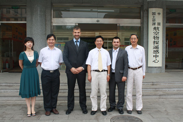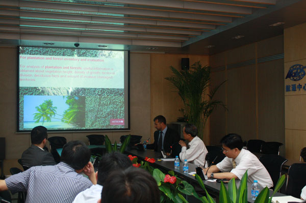 Edgars Shins先生首先介绍了其公司航空摄影技术及其相关应用成果,并提出了想与中心寻求合作的意愿。随后,熊总向外方大致介绍了中心物探、遥感两大技术在土地利用、矿山环境、生态环境等方面的应用情况。