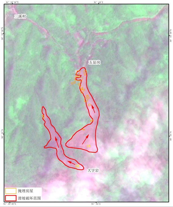 图2 三溪村滑坡灾后资源一号02C卫星遥感解译图