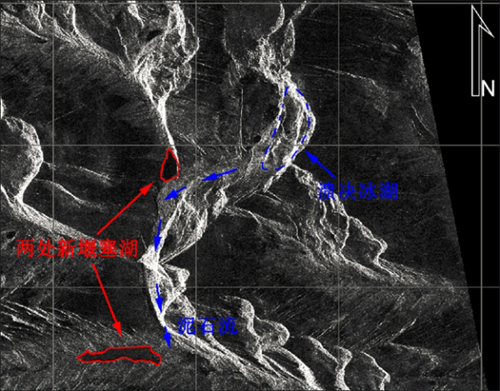 受天气影响,资源一号02C和资源三号卫星拍摄数据均被厚云覆盖。7月19日,雷达卫星过境获取了灾后数据。航遥中心迅速利用该数据进行了研判解译,初步判断本次灾害为灾前遥感解译的77号冰湖(热次热错,冰湖中心经纬度为E93°32'0.757",N30°28'15.013",面积约为57万平米)发生溃决,形成洪水与冰川泥石流灾害,根据遥感影像特征,热次热错的湖水已经基本完全排出。除洪水一次性爆发造成的灾害损失外,泥石流还堵塞沟道形成了两处堰塞湖,其中一处位于E93°30'31.10",N30°27'39.01",面积初步估计约为13万平米,根据地形判断堰塞湖体积为200万方,至7月18日泥石流堆积体尚未产生明显溢流。另一处位于E93°29'23.46",N30°25'29.7",面积初步估计约为40万平米,根据地形判断堰塞湖体积为450万方;根据雷达遥感影像的特征,堆积体已经被冲刷出现溢流,初步判断该堰塞湖水量不会明显再显著增加。由于泥石流堆积体的不稳定性,随着上游水量增加,两处堰塞湖较易发生溢流或溃坝,造成二次灾害。