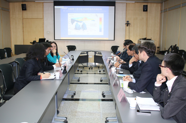 在双方介绍各自参与交流的人员后,熊总应邀向韩国地质矿产研究院代表团介绍了中心发展历史和概况,并重点介绍了中心航空物探技术的发展、软硬件设备研发和中心利用航磁、航重、航空电磁和航空放射性方法开展深部找矿、油气勘探、寻找地下水和放射性污染源探测等地质应用成果。韩国地质矿产研究院对中心航磁数据的采集、管理和分发应用模式十分感兴趣,熊总针对韩方提出的问题进行了细致解答。在韩方提出中心如何走上硬件设备尤其是航空磁力仪自主研发的道路时,熊总介绍了过往西方国家对我国进行航空物探技术封锁的背景情况,在面对外界技术封锁的困境,中心依靠自身科技实力,研发出了精度更优于国外的航空磁力仪,打破了西方国家长久以来的技术封锁,实现了航空磁力仪的自主研发和工程化应用。
