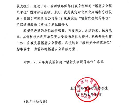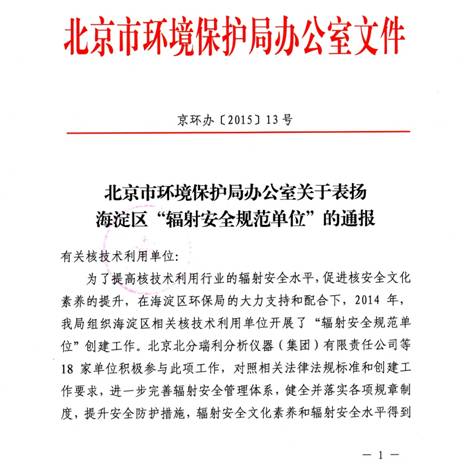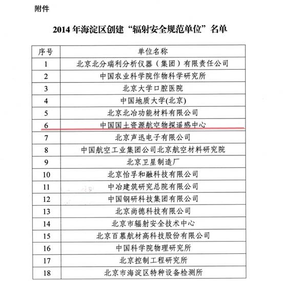 近日,航遥中心荣获北京市环保局授予的“辐射安全规范单位”称号。为了提高核技术利用行业的辐射安全水平,促进核安全文化素养的提升,2014年北京市环境保护局组织海淀区相关核技术利用单位开展了“辐射安全规范单位”创建工作。中心积极参与此项工作,在中心辐射安全领导小组的组织下,安全生产处、物业部综治办和物探部负责具体实施,按照相关法律法规标准和创建工作要求,进一步完善辐射安全管理体系,健全并落实各项规章制度,配合环保部门进行现场检查和文件档案查阅,并对中心辐射安全工作进行全面汇报,从而使中心辐射安全防护措施、辐射安全文化素养和安全管理水平得到大幅提升,通过了北京市、海淀区两级环保部门联合组织的“辐射安全规范单位”创建评估验收,得到了北京市环保局的通报表扬。中心及相关部门会珍惜荣誉,按照北京市环保局的要求,为首都的辐射安全贡献力量。