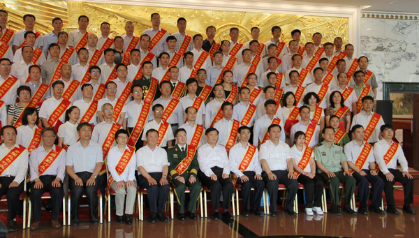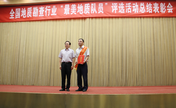 在表彰活动上,十名十佳最美地质队员一一上台领奖,石磊由中国地质矿产经济学会常务理事长赖文生颁奖,并合影留念。