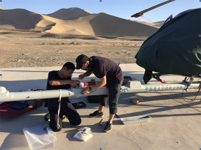 7月31日敦煌-阿克塞航磁调查项目在敦煌成功完成第一架次飞行。自7月21日B-7446飞机调机至测区后,物探部909队的肖刚毅、郭亮、蒋久明三名野外队员顶着50度的高温,在驻地沙漠直升机停机坪进行紧张的仪器装机和调试工作。经过几天的努力,于26日晚上完成装机工作,27日完成通电,28日完成静态测试,30日完成补偿飞行。