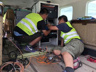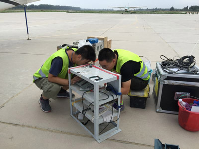 在安全护送重磁仪器抵达阿克苏机场后,902队立即如火如荼地开展了工作。在两天的时间里,完成了设备称重、重心计算以及布线等工作。8月1日902队迎来了最忙碌的一天,当清晨的第一缕阳光照射在塔克拉玛干大沙漠,902队早已迎着朝阳忙碌在机场。十二点过后,气温达到41℃,整个停机坪翻滚着热浪,但902队依然在姜作喜和朱自强的带领下,经过十几个小时的连续奋战,将重磁设备安装完毕,经过调试,所有仪器工作正常。随后,开始进行重力仪72小时的连续静态测试,虽然连续作战,但所有的疲倦都被完成工作的喜悦所驱散。