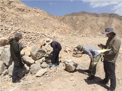 “兄弟们,再往山沟里面走一段,前面还有一个岩体在等着我们”,队长曹宝宝看了看图,如是说。队员郑宇舟收起记录本,段宏伟关上磁化率仪,周强收起锤头、扛起满袋的样品,继续前行。尽管他们已经连续工作六七个小时,尽管午餐时常是一个馕饼、一罐八宝粥、几口咸菜,但为了能够尽量测到每一个数据,为以后室内成果解释工作提供依据,他们毅然拖起疲惫的身躯,开始下一个目标点的征程……回到驻地,简单的晚饭后他们又开始处理当天的野外数据,设计第二天的线路,直至深夜……这就是工作组每天野外工作的缩影。