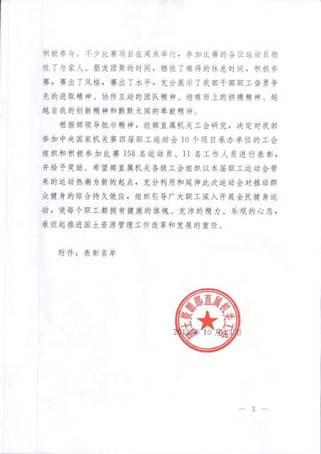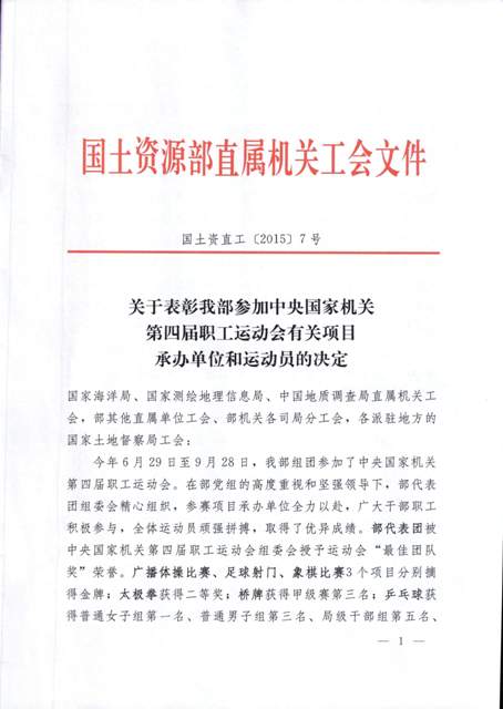 历时3个月的中央国家机关第四届职工运动会圆满结束,国土资源代表团取得了优异成绩并获“最佳团队奖”。日前,中心工会收到部直属机关工会《关于表彰我部参加中央国家机关第四届职工运动会有关项目承办单位和运动员的决定》,中心工会及9名职工分获集体和个人表彰,不仅为部、局争得了荣誉,还充分展现了航遥人良好的精神风貌。