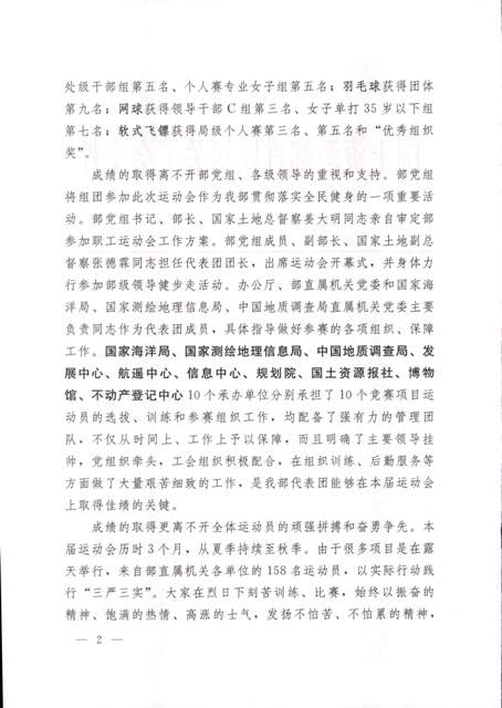 本次运动会,部代表团共参加了十个项目的比赛,地调局航遥中心作为部代表团桥牌项目承办单位,同时组织选派职工参加了桥牌、乒乓球、羽毛球、网球等赛事均取得了不错的成绩,其中承办的桥牌比赛获甲级赛第三名。在参与组织比赛的整个过程中,充分感受到了国土资源人的活力与激情,体验到了国土资源部的和谐发展与凝聚力,能为部代表团取得好成绩做出点滴的贡献感到由衷的幸福与自豪。