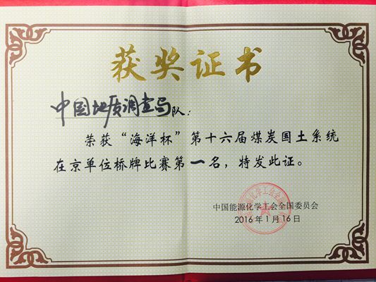 近日,由中国能源化学工会举办的“海洋杯”第十六届煤炭国土系统在京单位桥牌赛,在北京国家海洋局海洋减灾中心举行。由中心胡尚英、姜德仁、郭建华、王立军、赵泽华等为主组成的中国地质调查局直属机关2支代表队参加了本次比赛,最终取得比赛第一名和第四名的好成绩。