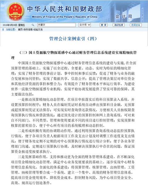 8月24日,财政部网站政务信息经验交流版块刊登了本年度第四期管理会计案例索引,中心通过财务管理信息系统加强管理会计的案例荣登上榜。