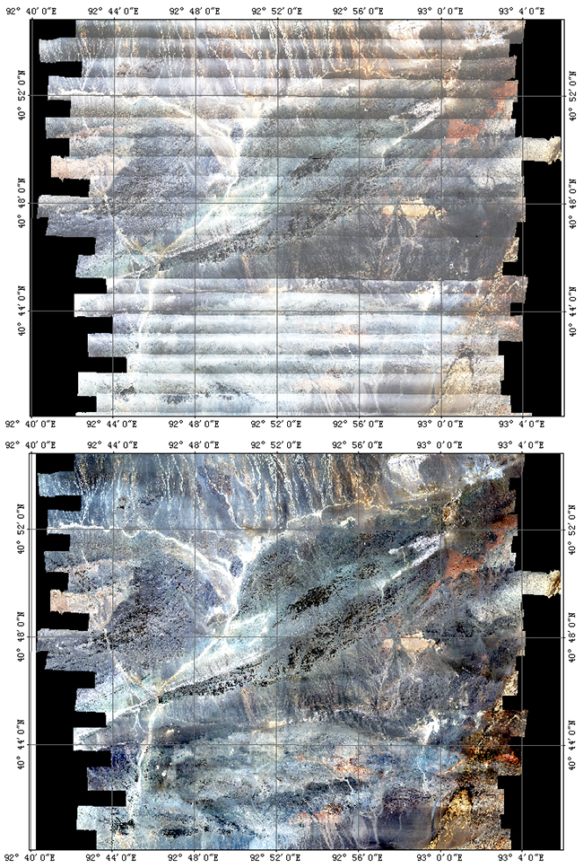试飞后,在掌握了仪器操作、使用、定标、数据处理等技术方法的基础上,中心正式将该仪器投入科研生产使用。目前,该仪器装载在运-12飞行平台上,开展二级项目“天山-北山重要成矿区带遥感调查”的航空高光谱数据获取工作。野外工作人员克服空域协调困难、沙漠地区气流不稳、低空飞行颠簸和超长时间连续作业等困难,目前已完成了四个满架次飞行,以及数据的几何校正、大气校正、BRDF校正与无缝拼接等预处理。