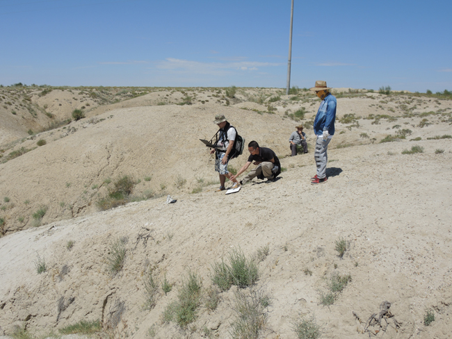 7月的准噶尔盆地腹地及边缘地段赤日炎炎、尤其中午12点到下午4点时间段平均温度达35℃以上,火辣辣的太阳直射地面,地表土壤温度可达40-50℃,项目组人员头顶烈日,精神饱满地投入到每个观测点的定位、观察、记录、取样(洛阳铲挖≥50cm深)、波谱测试、照相等工作中。通过本次野外地质工作,实地考察了工作区微地貌类型变化特点,获取了区内交通、古河道、沟谷水系及植被发育信息。经初步野外定点观察和光谱测量,掌握了工作区地表土壤中与油气微渗漏吸附烃类气体密切相关的蚀变粘土矿物的类型、含量与实际分布状况,植被发育类型及中毒枯黄坏死状况,地貌微凸起、凹陷与隐伏区域构造关系等宏观地质现象,这些初步调查成果将为下一步航空高光谱数据处理及油气异常信息提取提供具体依据。