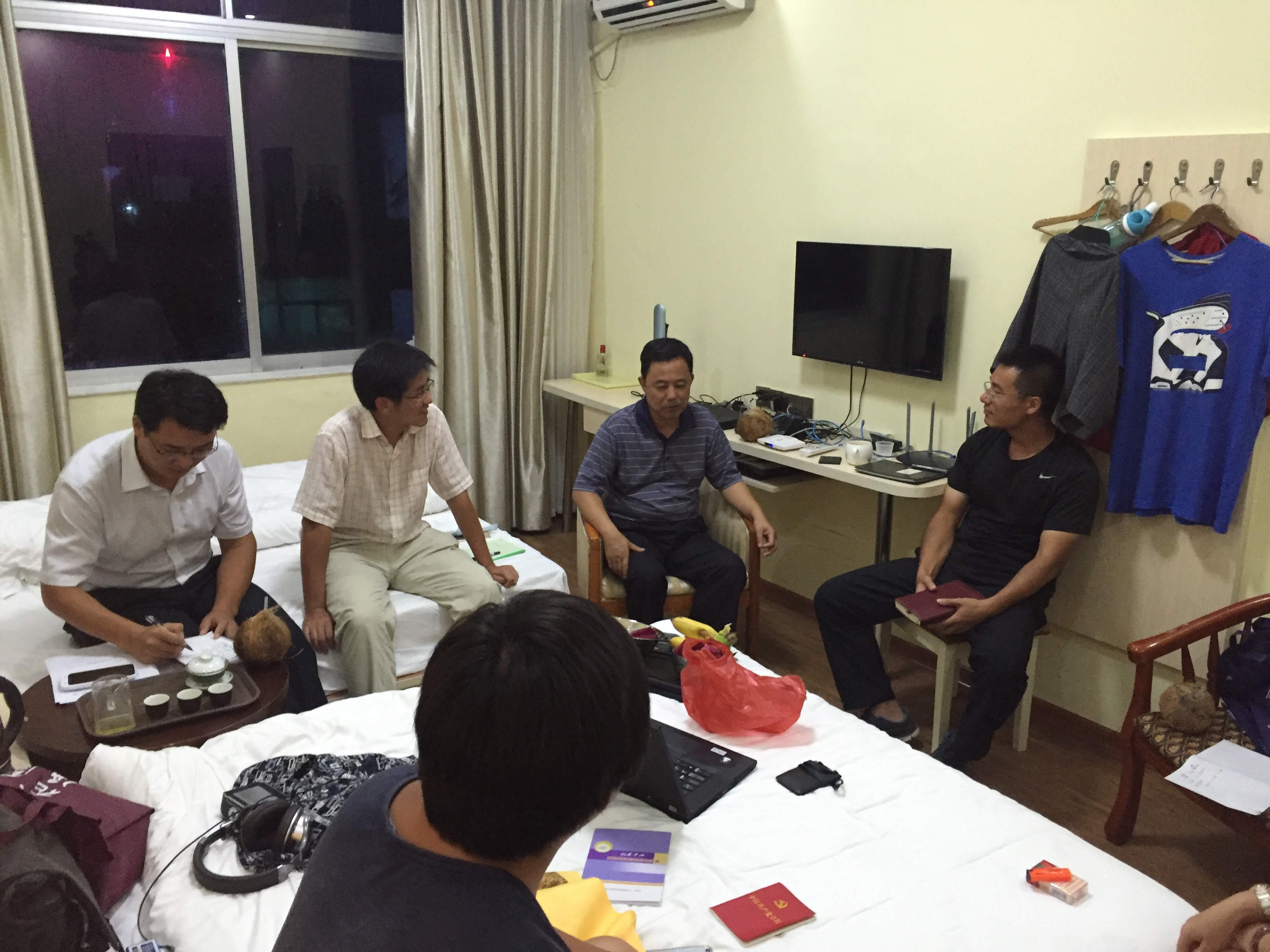 李知用书记一行每到一处,都前往飞行场地、日变观测站和野外队驻地认真察看工作和生活环境,了解机场协调、工作流程和安全防护措施等方面的情况,并在每个野外队都召开了座谈会,与野外队同志们进行了沟通交流,详细了解生产进度情况、财务管理、党支部建设、廉政建设、职工思想状态、工作生活中存在的问题和困难。在开展野外调研工作的同时,对野外安全生产和保密工作进行了检查并提出相关要求,并按照局有关部署,组织填写了野外职工“四态”调查问卷。