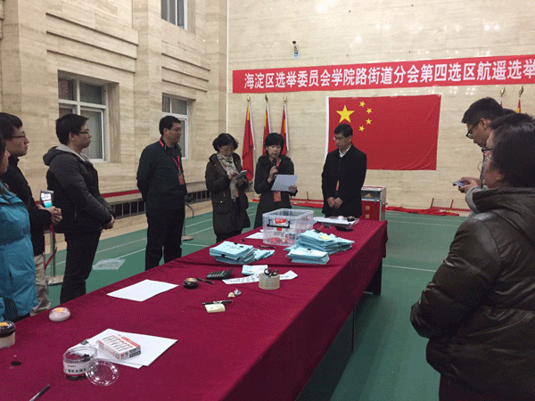 选举现场设在中心遥感楼的大厅。早上八点,中心选举站的工作人员已经全员到位,随着总监票人投下第一张选票,中心选举站的投票工作正式开始。选区选民不畏寒冷陆续来到选举站踊跃投票。选民凭选民证通过验证发票及复核等程序领取选票,在工作人员的细心解说下,认真填写选票,纷纷投下了自己庄严的一票。整个投票现场秩序井然。为了方便选民进行投票,第四选区的工作人员还携带流动投票箱赴良乡、周口店为因工作原因不能到场的选民投票。15日24时,投票选举工作宣告结束。