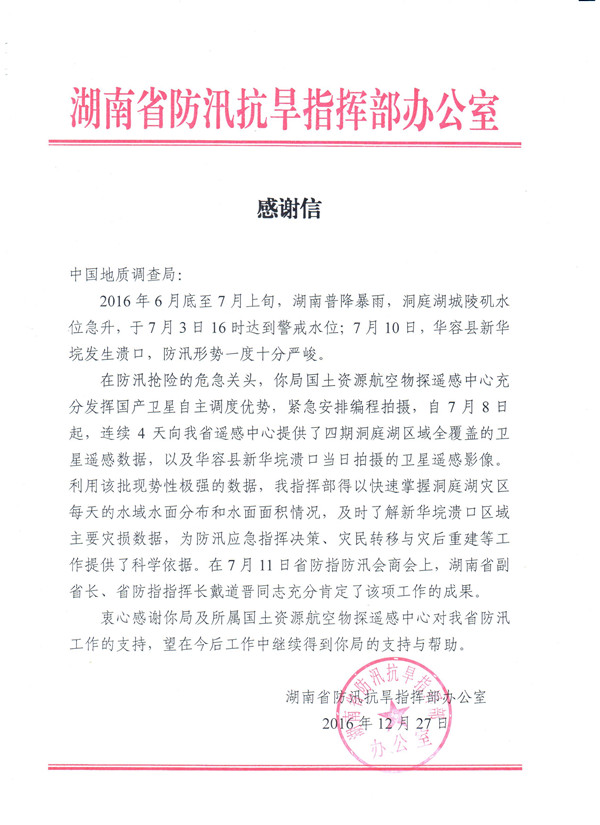 2016年夏季,湖南普降暴雨,防汛形势严峻。中心充分发挥国产卫星快速、全天候的技术优势,拍摄的卫星遥感影像为湖南省防汛工作提供了科学决策依据,得到了湖南省防汛抗旱指挥部的充分肯定。近日,特向地调局发来感谢信对中心开展的相关工作给予感谢。在今后的工作中,中心将继续发挥技术优势,为防灾减灾工作做出应有贡献。