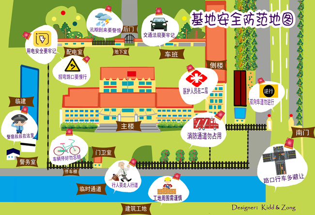 为引起广大干部职工对基地安全生产工作的重视,在安全生产月期间,中心绘制了简单易懂、趣味性极强的《基地安全防范地图》。该地图融入了大量的卡通元素,生动活泼、清晰明了,在广泛征求了各部门的意见后,最终圈出了12个安全防范关注点。