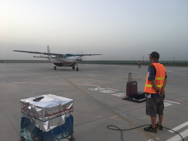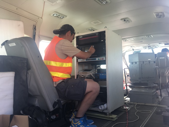 项目组利用新疆且末机场开展作业。位于塔克拉玛干大沙漠深处的且末县天气恶劣,尤其是入夏以来,地表温度连续保持在40℃以上,高温、风沙给飞行工作带来了极大难度。为了保证测量系统正常运行,项目组成员在每天的飞行工作之余,更需要在气温最高的时间段进场通风,为测量系统通风降温。操作人员每天需要在40℃的高温下持续工作3小时以上,才能保证测量系统处于“健康”状态。在塔克拉玛干深处,航遥人高温下奉献青春和热血的缩影,正是新时期地质人精神面貌的真实写照!