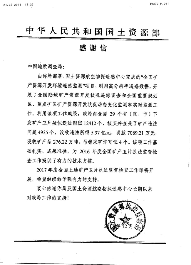 12月14日,国土资源部执法监察局向中国地质调查局发来贺电,对中心完成的“全国矿产资源开发环境遥感监测”工作表示感谢。