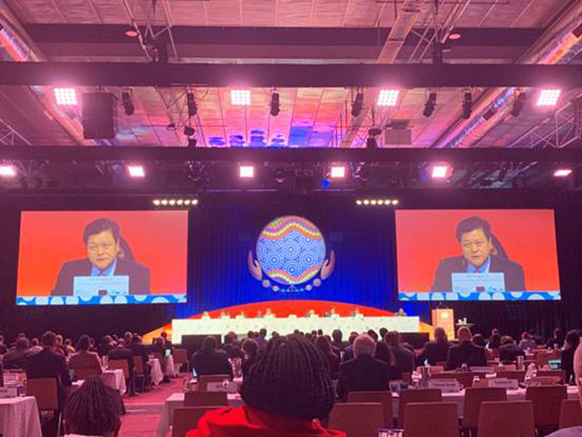 会上,中国正式接任地球观测组织2020年轮值主席,将进一步积极推动应对气候变化、减灾和可持续发展三大优先事项,推进对地观测助力数字经济以及发展中国家可持续发展。在部长级峰会上,作为地球观测组织中国首席代表、中国联合主席执行代表,自然资源部中国地质调查局副局长李朋德宣布了中国设立政府间国际科技创新合作专项,强力支持地球观测组织工作,同时向参会代表分享了我国高分一号和高分六号卫星16米数据面向国际社会开放共享的最新信息,受到与会代表的高度关注和赞扬。
