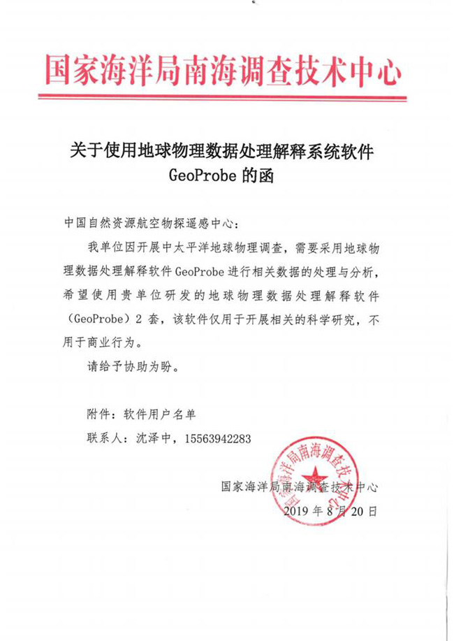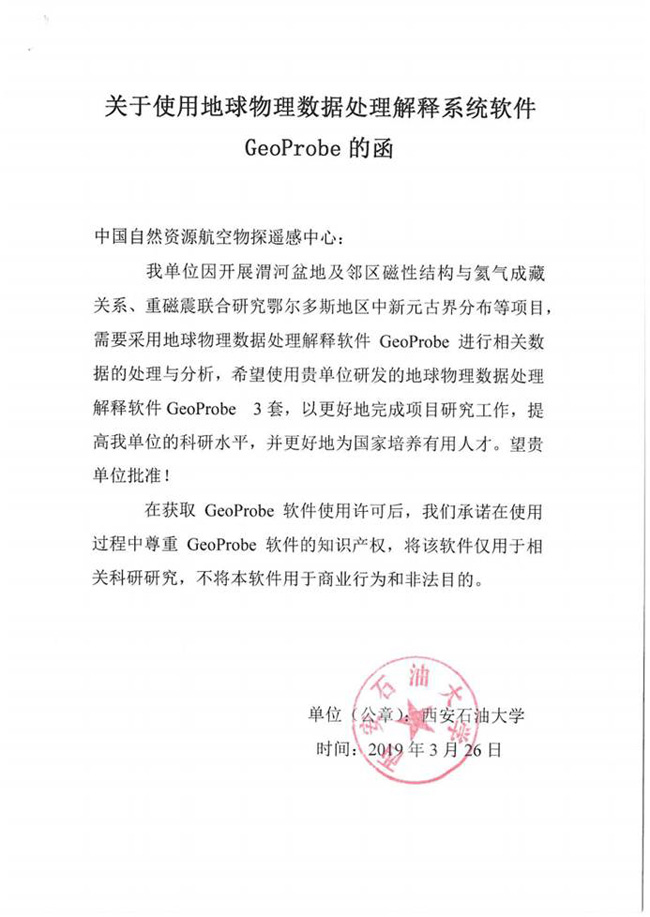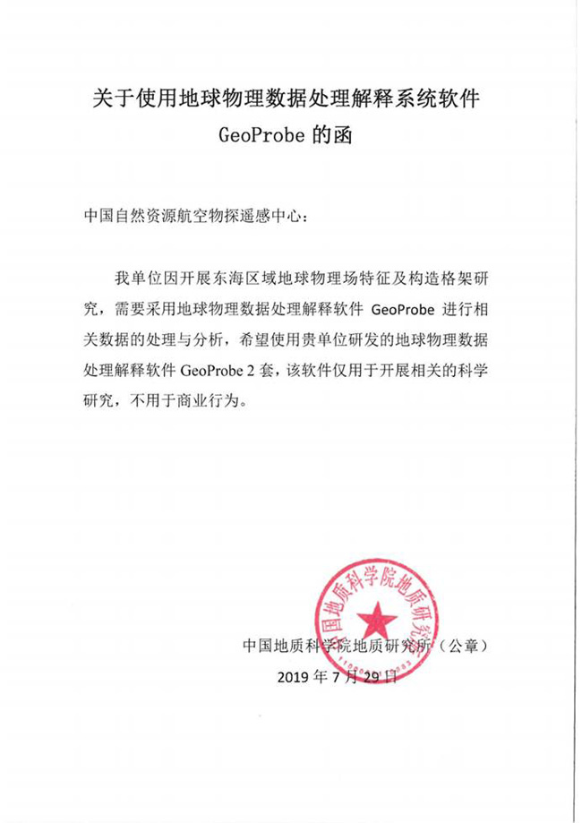 2019年,自然资源部中国地质调查局自然资源航空物探遥感中心接收到中国地质科学院地质研究所、国家海洋局南海调查技术中心、西安石油大学等16家行业单位和科研学校发来的GeoProbe软件使用申请公函,共发放GeoProbe软件239套,其中升级48套。