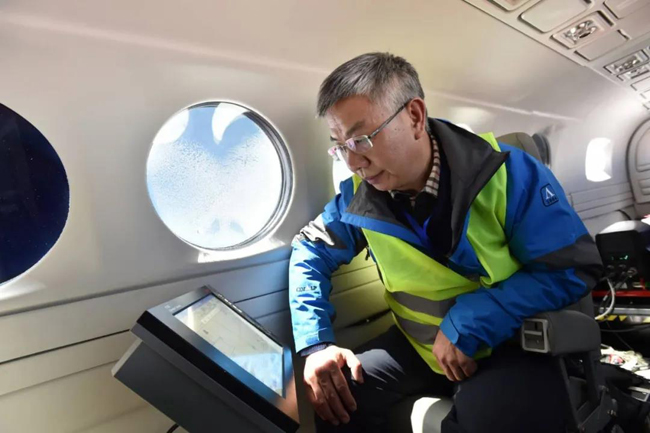 2020年5月,熊盛青在飞机上执行珠峰高程航空重力和遥感综合测量任务