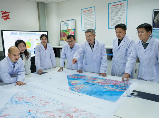 2020年1月,熊盛青(右三)与专家一起讨论航空物探测量成果的地质解释与应用工作航遥中心 供图