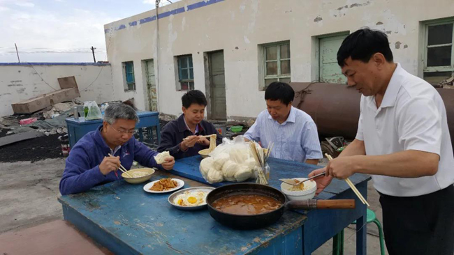 2016年8月,熊盛青(左一)与科研实验组专家在野外一线共进早餐