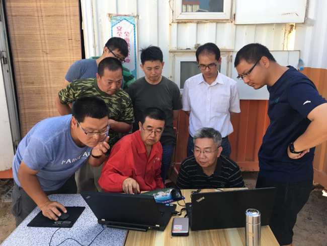 2018年8月,熊盛青(前排右一)在野外试验现场与专家研究时间域航空电磁试验中存在的问题