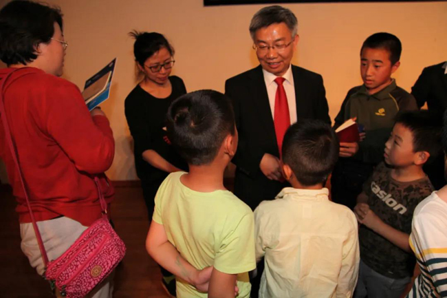 2017年4月,熊盛青(中)在中国科技馆做科普讲座,耐心为小朋友们解释
