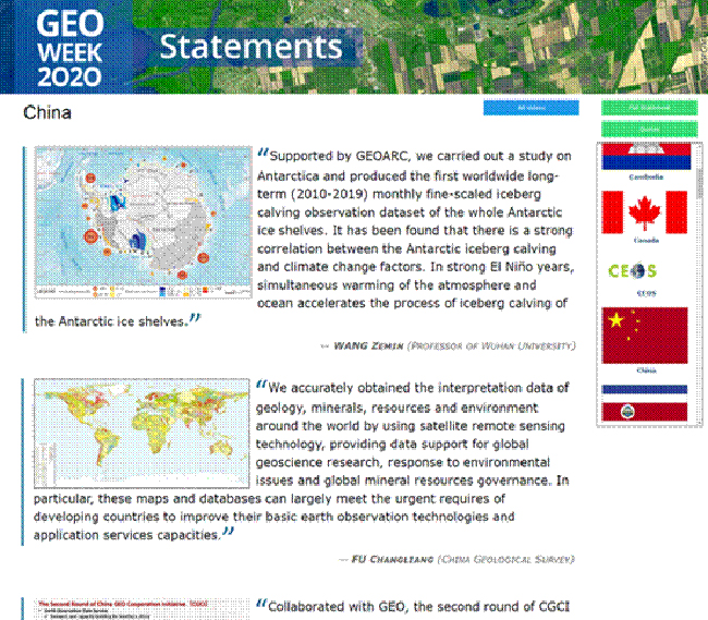 由航空物探遥感中心承担完成的“全球地质矿产与资源环境卫星遥感‘一张图’”工程成果代表地调局作为我国对地观测技术应用的突出案例入选GEO中国国家报告,并在会议周专题网站http://www.earthobservations.org/geoweek2020_statements.php展示。
